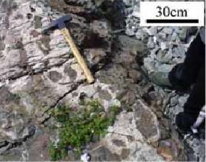 菜生コンプレックスのメランジェと斑糲岩岩脈,四十寺山層の火山岩礫岩.D1劈開に切られる玄武岩岩脈.シース褶曲と斑糲岩シル. D0正断層とD1境界スラスト.D−(マイナス)1とD1劈開をもつチャート岩塊.時間次第で,手結メランジェなどのオプションあり.