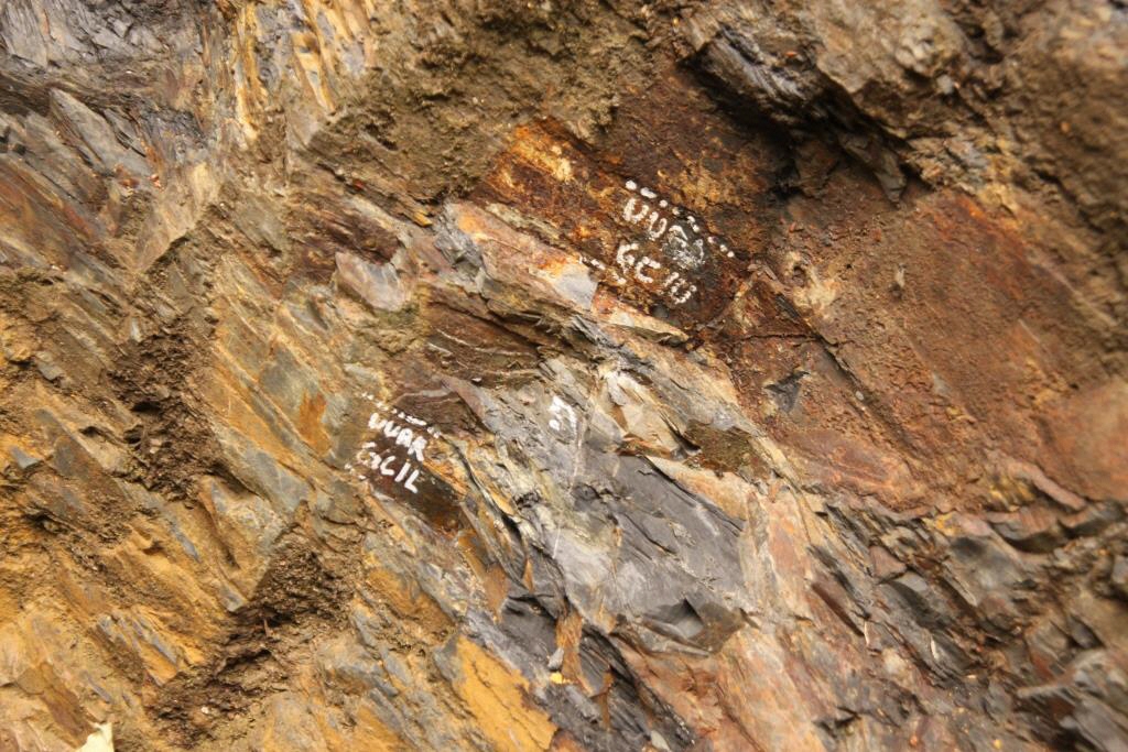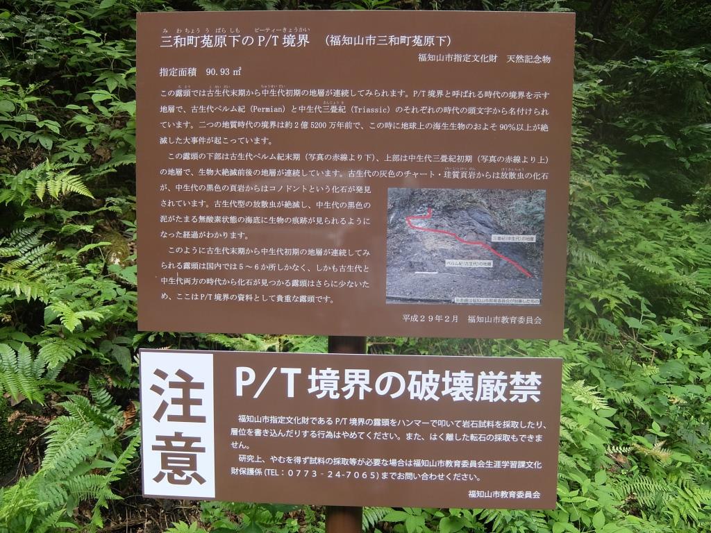 京都府福知山市三和町菟原下の林道沿いに露出する珪質泥岩の露頭では,はじめに桑原ほか(1991)によりペルム紀最末期の放散虫化石が報告され,後にYamakita et al.(1999)により三畳紀最初期のコノドントが発見されたことで,ペルム紀-三畳紀境界をまたぐ極めて重要な露頭であることが証明されました.このことは京都府レッドデータブック(楠,2015)でも指摘され,人為的破壊が進まないよう保存が求められました.これらの指摘を受け,2016年8月24日に市の天然記念物に指定されて保護が図られ,露頭の科学的意義を解説する説明板が今年の2月27日に設置されました(写真1).それにもかかわらず説明板設置後,二回にわたって無断で露頭にペイントで数字等を書き込み,試料採取を行ったと疑われる行為がありました(写真2).非常に残念なことです.露頭の地主さんをはじめ地域住民からも研究者の常識を疑う声が上がっています.私たちはこの無許可の破壊行為に対し断固として抗議し,二度とこのような勝手な行為が行われないよう求めます.
