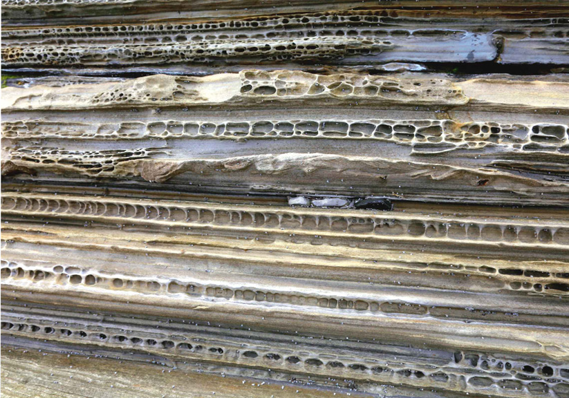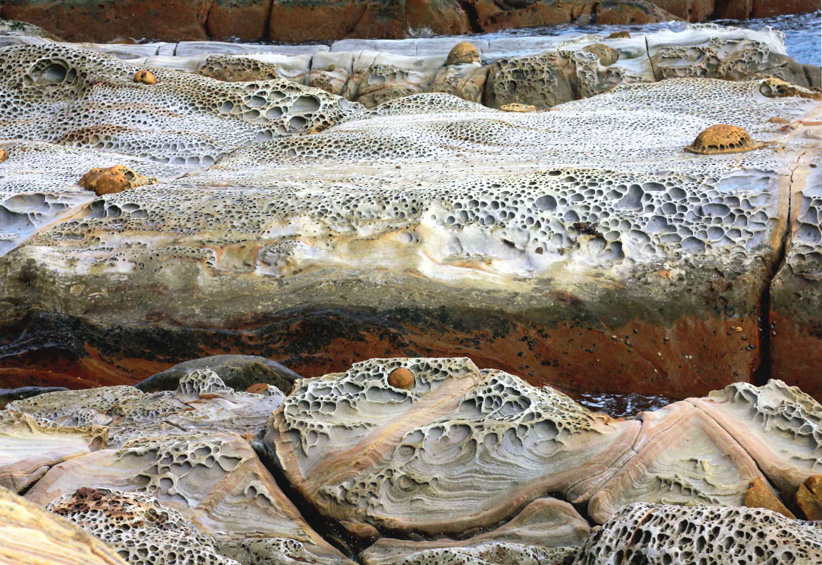 この竜串海岸は,岩を海蝕風化させ万化の模様を営々といまも創造しています.人間の想像もつかない神秘な石を鋭利なハモノを振って彫り上げた彫刻のようです.砂岩に刻まれた海蝕連痕模様.鮮やかな褶曲地層が浮かんで雄大な景観をみせてくれます.
