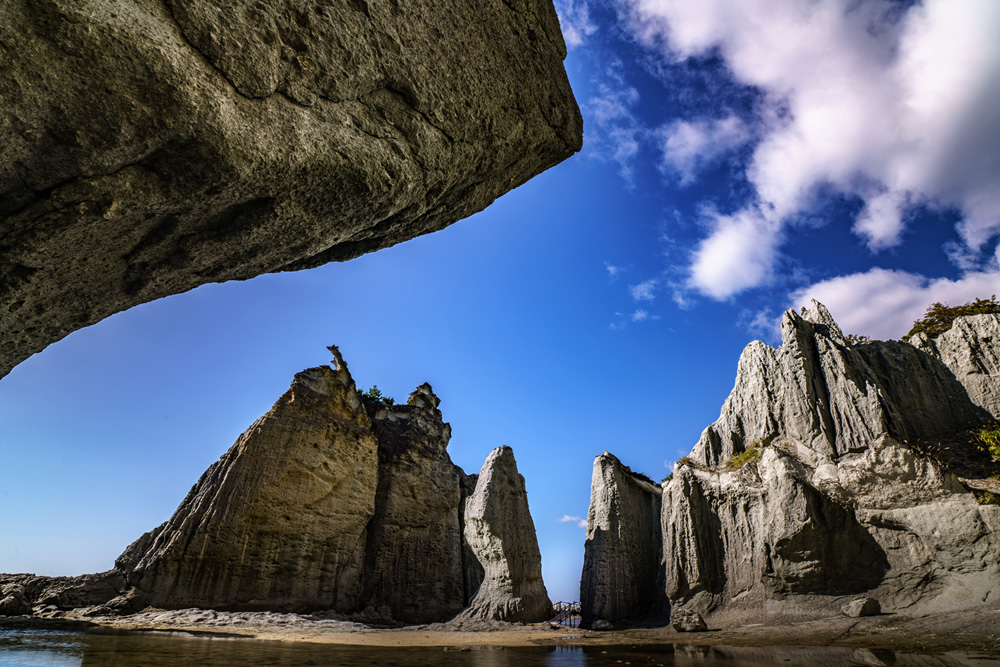仏ヶ浦は下北半島西部にある景勝地で,2000万年前の海底火山噴火で噴出した凝灰岩の浸食によってできた断崖・尖塔が連なっている場所です.陸上・船から多数の写真が撮影されています.今までに見たことのないアングルで,この作品を最初に見た時には仏ヶ浦とはわかりませんでした.低い撮影姿勢で手前に凝灰岩を大きく,青空と白雲の向こうの遠景には尖塔を配置しています.手前の凝灰岩や遠景左側の岩は日陰ですが,うまく露出をコントロールして,質感を失わないようにしています.爽快感のある,力強い作品です.