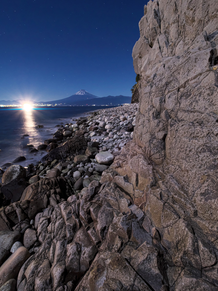 伊豆半島の北西端には大瀬崎があり,その南500mに大瀬崎火道があります.縦位置のこの作品では右半分に大きく大瀬崎火道の溶岩を,その向こうには愛鷹山と富士山,そして沼津市の街明かりを配置しています.大瀬崎南火道に月光が当たる月齢や時間をよく計算された上で撮影されたのでしょう.足場の悪い海岸を夜に歩いて行かなければなりませんが,勝手を知った地元の人ならでは作品です.