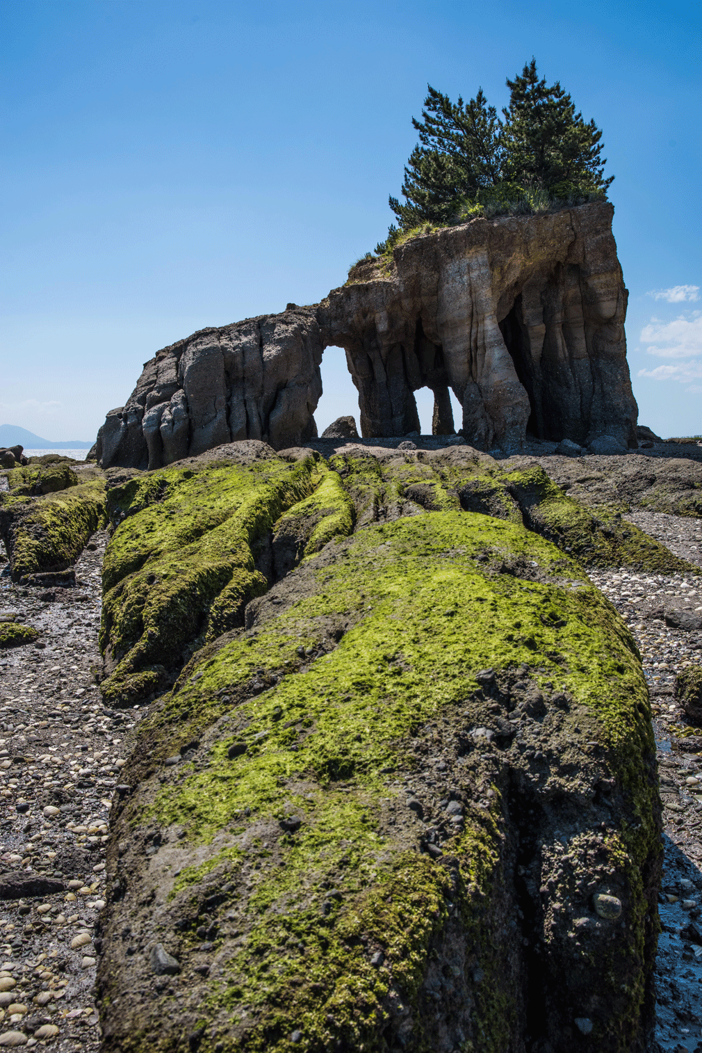 「くぐり岩」と呼ばれる奇岩を、海岸の苔むした岩の向こうに見てみると、岩がまるで草を食べている恐竜のように見えました。