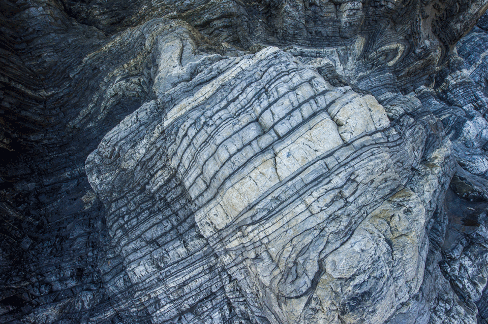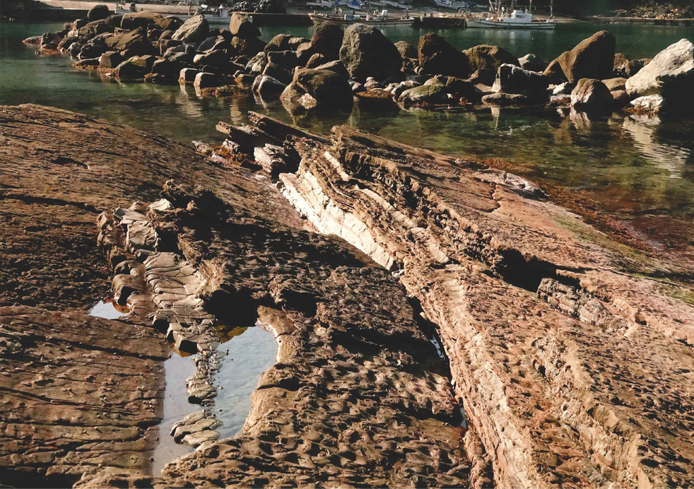 チャート/泥岩 互層でしょうか、きれいな縞模様になった地層が波に洗われている一帯があります。人里離れた場所で、付近は7年前の津波でなぎ倒された木々が当時のままになっていますが、海岸の岩は割れたりすることなくそれまでと同じようにそこにあります。その場所で幾度もの大津波を経験しているだろうことを想像しました。