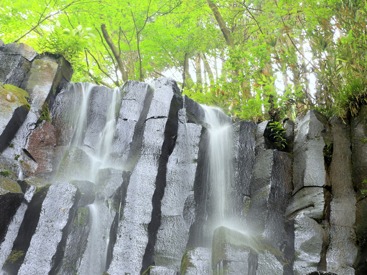 六方の滝は,箱根火山のカルデラ形成期噴出物である幕山溶岩にかかる落差20mの滝です.作者は望遠レンズで滝上部をクローズアップしました.滝の飛沫に濡れた柱状節理の岩肌が美しく,後方の新緑と相まって落ち着いた雰囲気の作品となっています.