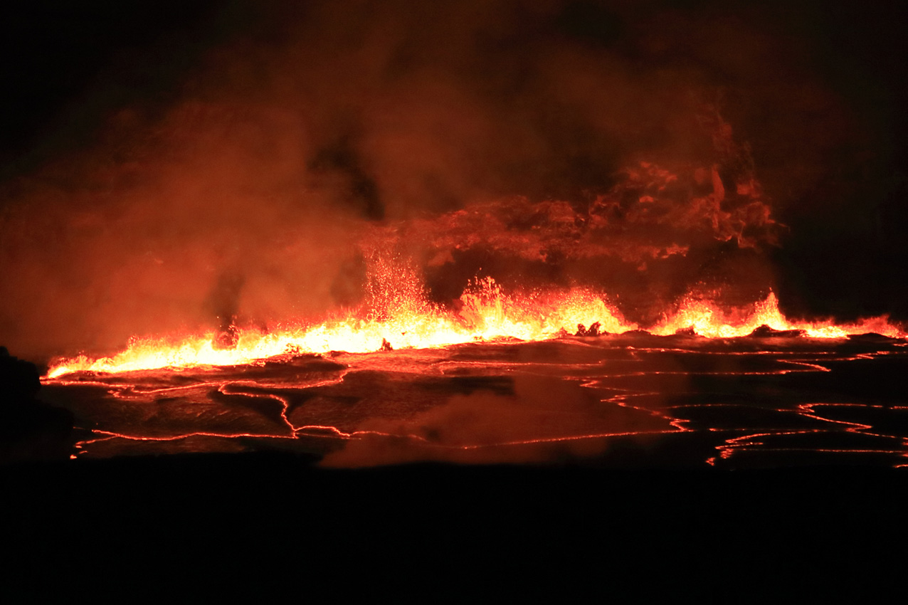 最初はエチオピアのエルターレ火山の溶岩湖を撮影した作品と勘違いしましたが,キラウエア火山ハレマウマウ火口の直径150m程の溶岩湖の溶岩水位が運良く上昇した時を捉えて撮影した作品でした.このように撮影できたのは最近数十年間ではわずか数か月だけ.その後,南東山麓からの割れ目噴火によってキラウエア山頂部は陥没し,この溶岩湖も消滅しました.