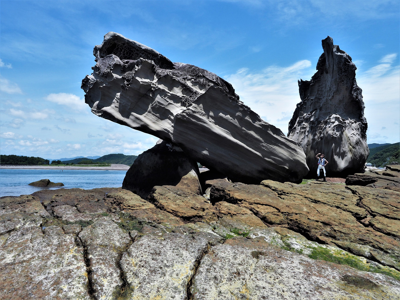 "南紀熊野ジオパーク,エリア内の奇岩です.干潮時に現れるひび割れた岩肌から奇岩を撮影しました.遠近法で人物を小さく見せることで,もたれかかった岩をよりダイナミックに表現しました. 後ろに垂直に立つ奇岩も引き立て役となって巨大な大砲のように見えました.".