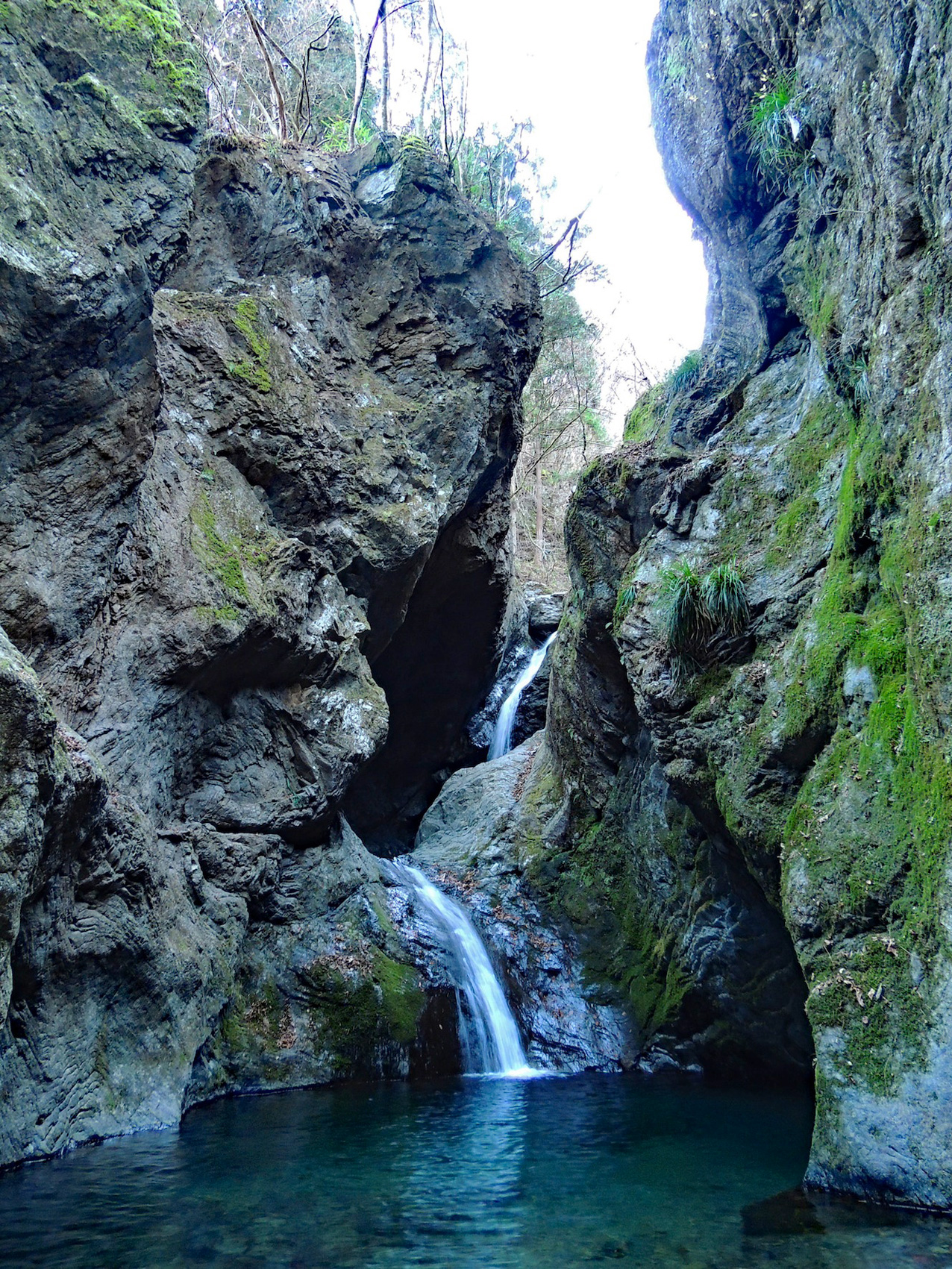 東京都西多摩郡奥多摩町にある海沢三滝の一つ「ねじれの滝」を撮影しました.夏は一面緑の苔に覆われますが, 冬は褶曲した層状チャートのごつごつとした岩肌が現れます.