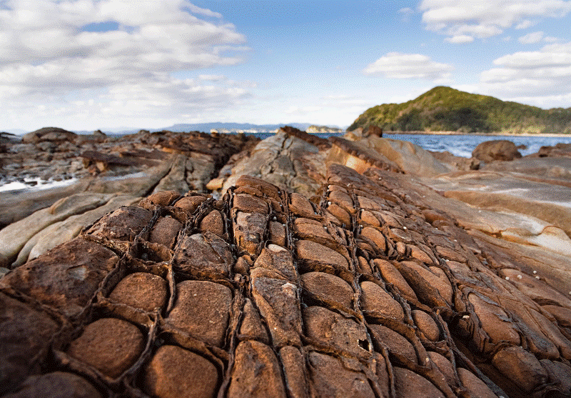 長崎県の九十九島は南北2地域にわかれており、北は北九十九島、南は南九十九島と呼ばれている。北九十九島は前期〜中期中新世の野島層群、南九十九島はそれよりも下位の相浦層群からなる島々である。どちらも主に白色砂岩と暗灰色泥岩の互層からなり、海岸沿いに露出する砂岩には塩類風化(岩石表面に塩の結晶が析出する際、結晶が成長する圧力で岩石の表面を破壊する作用)によって形成されるタフォニと呼ばれるへこみが目立つ。枠に入ったチョコまんじゅうのようなこのふしぎな形状も塩類風化が原因の可能性がある。(小松原純子:産業技術総合研究所)