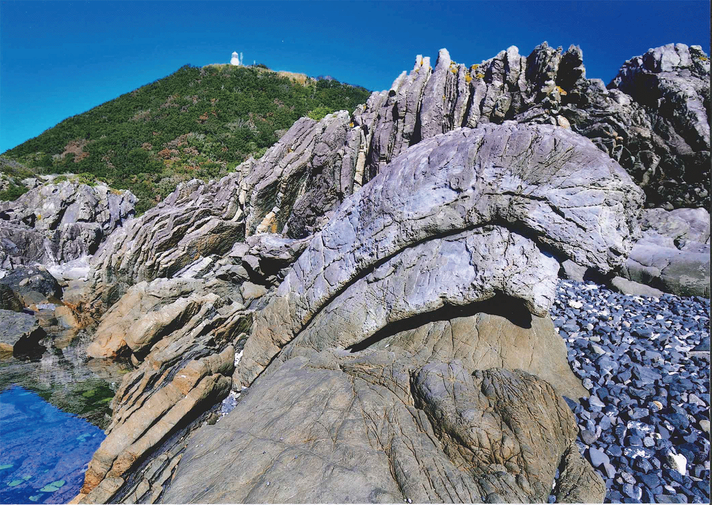 室戸岬にみられる縞々の地層は,土砂が深海底に運ばれ堆積したタービダイトと呼ばれる地層です.海洋プレートが大陸プレートの下に沈み込むときに,海底の表層部にあったタービダイトは剥ぎ取られて大陸の縁に付加し,付加体が形作られます.付加体が作られる過程で、もともと水平だった地層は,折れ曲がったり,垂直に立ったりしてしまいます.地震により隆起する室戸岬では,海の中から付加体が顔を出し,新しい大地が誕生している場所になります.地質学的には室戸岬のタービダイトは四万十帯南帯に属し、およそ漸新世―中新世の年代を持つ最も新しい時代の付加体にあたります。背景にある山は隆起量が大きいところで出来る海成段丘で,その段丘面から白い灯台が室戸の人々を100年以上も見守っています.(高橋 唯:室戸ジオパーク推進協議会)