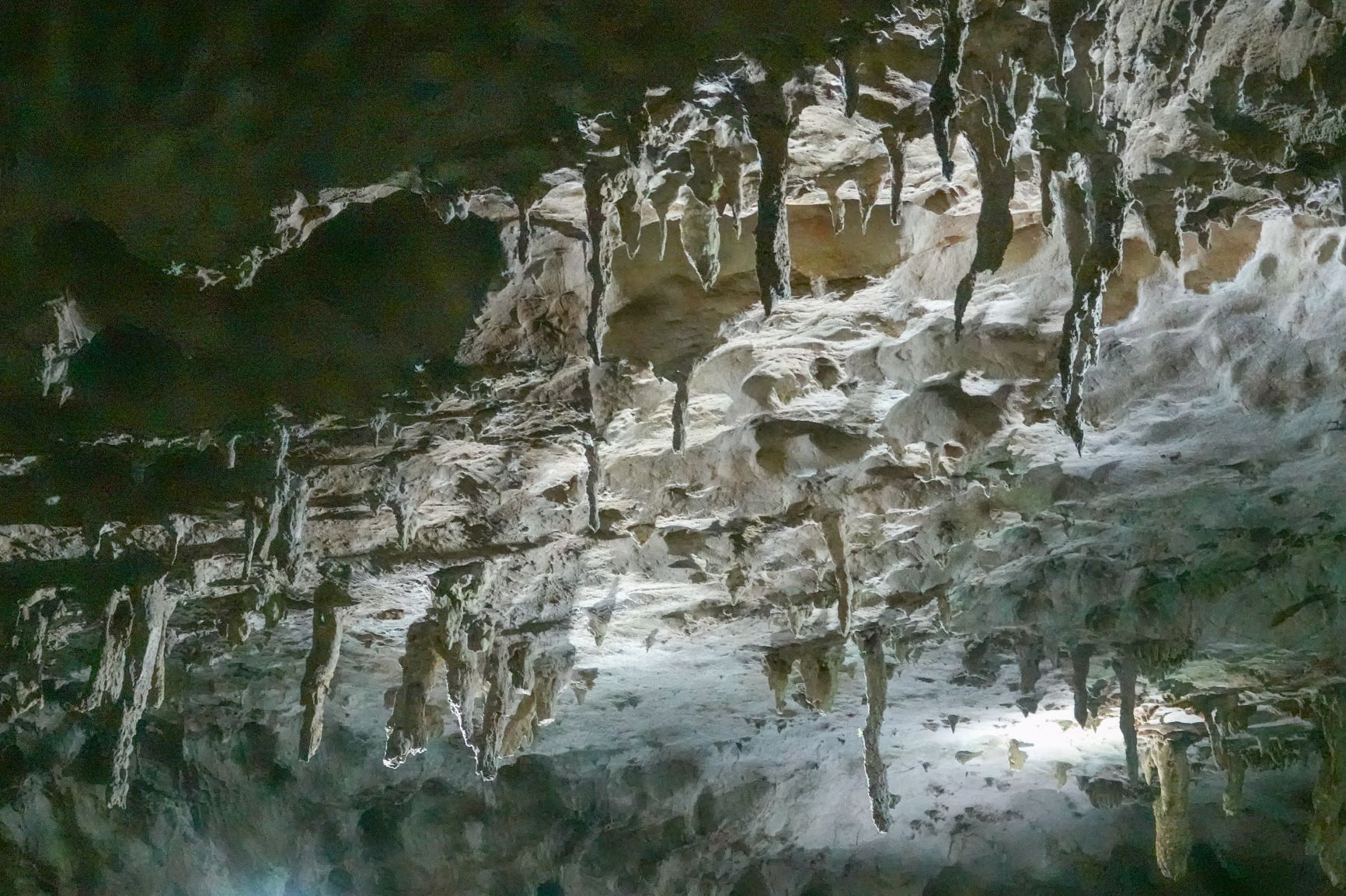 鍾乳洞の奇景「傘づくし」です。天上からぶら下がるコウモリの群れのように見えました。
