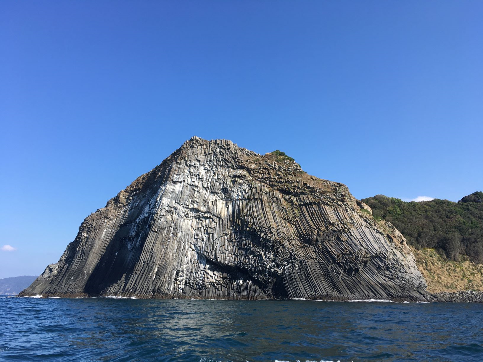 糸島半島には白亜紀の花崗閃緑岩が広く分布しているが、それを貫入もしくは被覆して鮮新世のアルカリ玄武岩が点在する。これらアルカリ玄武岩の岩体は浸食に強いため岬や丘陵の頂部を形成している。この露頭はそのような岬を遊覧船で海側から見たもので、一部は海食洞になっており芥屋の大門(けやのおおと)と呼ばれている。全体に柱状節理が発達する。