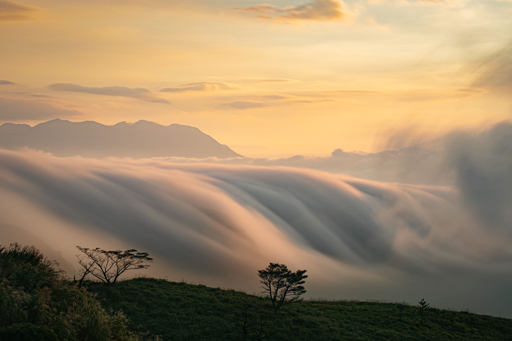 阿蘇の外輪山から流れ落ちる濃霧の様子です。夜のうちは外輪山の上に溜まってた濃霧が、日に出の時間になると一斉に流れ落ち始めました。自然の壮大さと力強さは感動するしかなかったです。