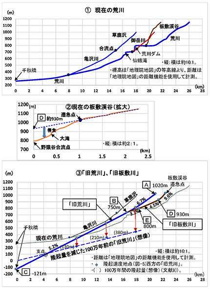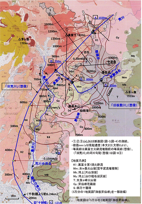 ¡¡¸æ³ÙÀî¤Î£ÅÃÏÅÀ¤Ç¤Ïɸ¹â800£í¤Ë¡ÖK1²ÐºÕή¡×¤ÎÄìÌ̤¬¤¢¤ê¡¤¤³¤ì¤ò¡ÖµìÈÄÉßÀî¡×¤Î²Ï¾²É¸¹â¤È¤·¡¤¤½¤Î²¼Î®¤Î¡Öµì¹ÓÀî¡×¡¦¡ÖµìÈÄÉßÀî¡×¹çήÅÀ¡Ê£ÂÃÏÅÀ¡Ë¤Îɸ¹â¤ÏÌó750m¤È¤·¤¿¡¥¡ÖµìÈÄÉßÀî¡×¤ÎÌî±îë¹çήÅÀ¡ÊDÃÏÅÀ¡Ë¡Ê¿Þ-5¡Ë¤Îɸ¹â¤Ï¡¤ÈÄÉß·Ìë¤ÎÁ«µÞÅÀ¤ËÃåÌܤ·¡¤Á«µÞÅÀ¤ÏÌî±îë¤Î·ÁÀ®¤¬»Ï¤Þ¤Ã¤¿¤³¤È¤Ë¤è¤ê·Ìë¤Î²¼Î®¤«¤é²¼¹ï¤¬¿Ê¤ó¤Ç·ÁÀ®¤µ¤ì¤¿¤È¹Í¤¨¡¤Á«µÞÅÀ¤è¤ê¾åή¤Î²Ï¾²¸ûÇÛ¡Ê9.6%¡Ë¤ò²¼Î®¤Ë±äŤ·Ìó930m¤È¤·¤¿¡Ê¿Þ-6¢¡Ë¡¥
