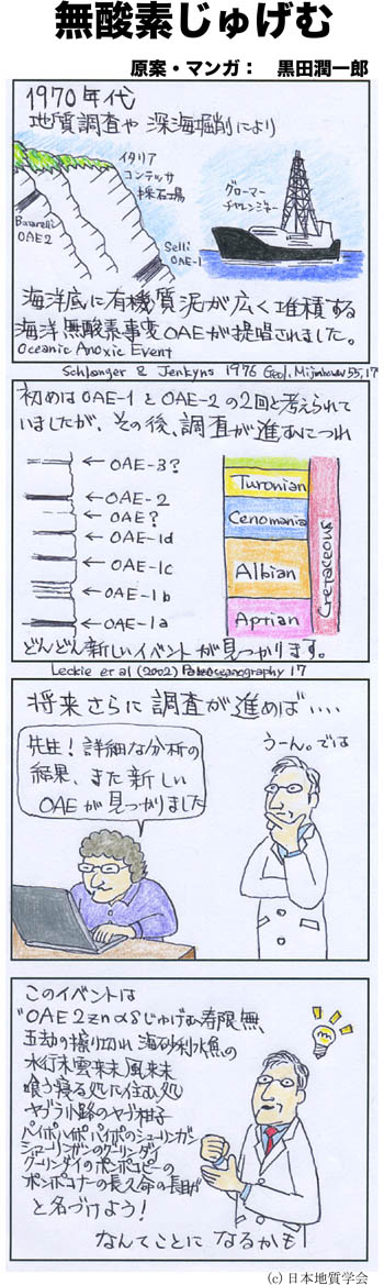 海洋無酸素事変は、海洋底に有機炭素に富む泥(黒色頁岩)が広く堆積するイベントです。中生代のジュラ紀や白亜紀に繰り返し起こったことが報告されています。初めて海洋無酸素事変という概念が提唱されたのは、1970年代のことです。Schlanger and Jenkyns (1976)が、白亜紀Cenomanian-Turonian境界で異常に有機炭素濃度が高い堆積物が世界各地に存在することを指摘し、OAEの概念を提唱したのが始まりです(1)。その後、Jenkyns (1980)は白亜紀のBarremian-Aptian-AlbianとCenomanian-Turonianの2回(+より小規模なBoniacian-Santonian)のOAEを提唱し、白亜紀OAE研究の基本的枠組みを築きます(2)。その後の調査が進むにつれて、Barremian-Aptian-AlbianのOAEはさらにOAE-1aからOAE-1dの4つのイベントとして認識されるようになりました(3)。白亜紀OAEでは、黒色頁岩の堆積は主に大西洋、テチス海や北米Interior Seawayなどが中心ですが、OAE-1aや-1dでは、太平洋の海山や海台でも黒色頁岩が堆積しており、グローバルイベントであったことが示唆されます。