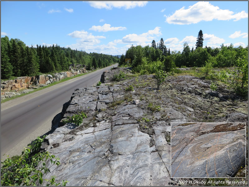 【露頭の位置】District of Algoma Province, Ontario, Canada.スペリオル湖東岸のMichipicoten Bayの南東側.トランスカナダハイウエイHWY17をWawaの町から11.1 km南下した場所. 北西にはBridget Lake,南東にはAntoine Lakeがある. 47°53’44.5”N 84°50’48.5”W をグーグルマップで検索し, 場所が表示されたらストリートビューにすると,道路の東側の露頭を見ることができる.