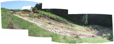写真−2に示した表層崩壊では粘土化した凝灰岩が滑落面に認められ,これが地質的素因であると推測された.2009年(平成21年)の中国・九州北部豪雨災害、そして今年の広島豪雨災害などでは,土砂災害の地質的素因として,マサ化した風化花崗岩の存在が注目されているが,凝灰岩における土砂災害メカニズムについても,これらの被災地域で,さらに詳しく調べる必要があることを実感した土砂災害でもあった.
