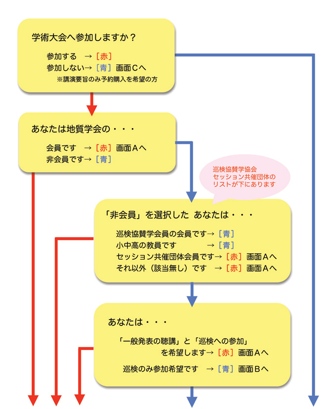 | 下のフローチャートに従って進み,該当する申込画面をクリックして それぞれ申込手続きをおこなって下さい. |